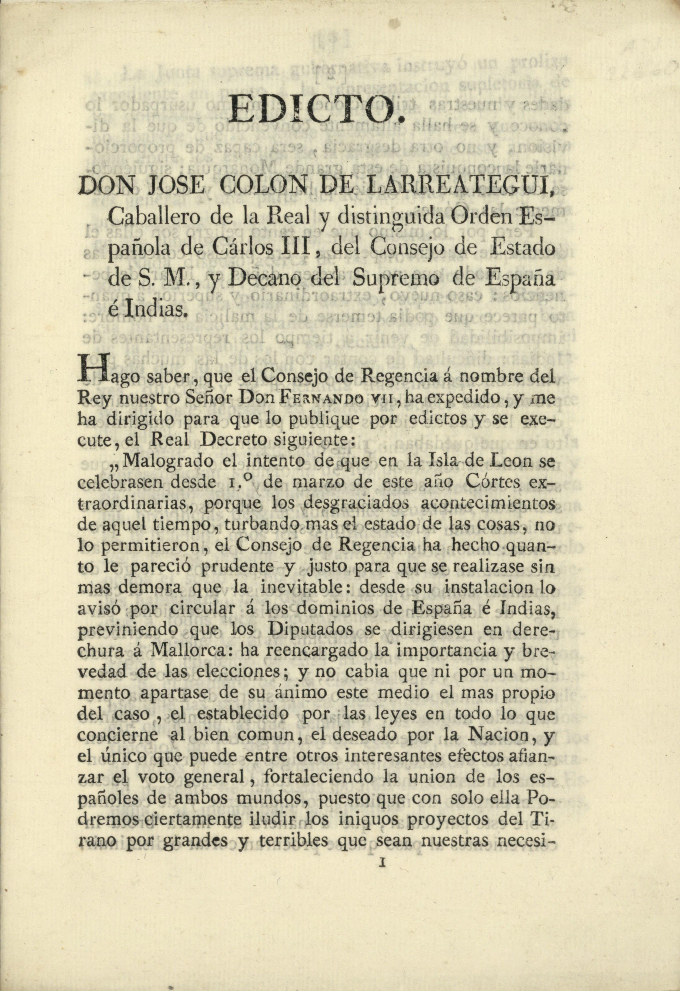 | Title: | Edicto. Don José Colón de Larreategui, Caballero de la Real y distinguida Orden Española de Carlos III, del Consejo de Estado de S.M. y Decano del Supremo de España e Indias. |