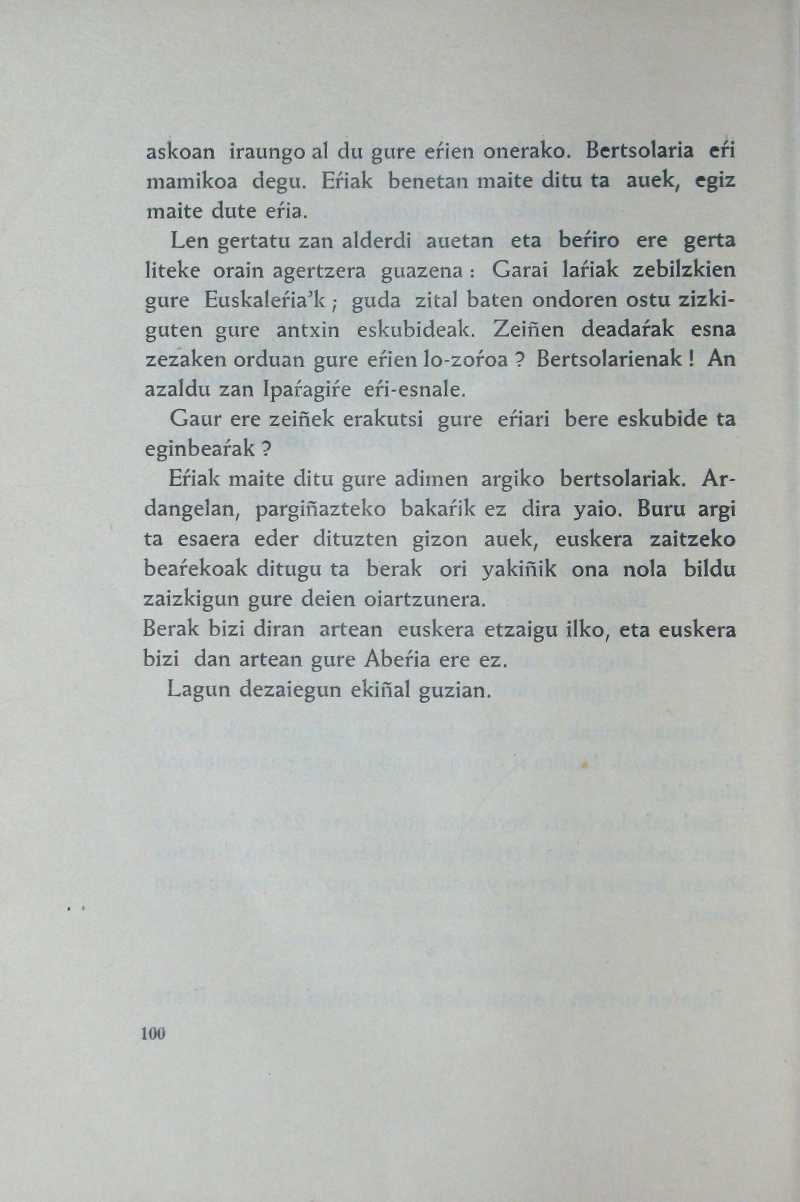 | Deskribapena: | En port.: Guduko bertsoak eusko gaztedikoak yasoak Dialecto : texto en euskera central -- guipuzcoano S. XX -- Periodo : último euskera moderno Euskalkia : erdialdekoa -- gipuzkera XX. md. -- Aroa : azken euskara modernoa Digitalización Vitoria-Gasteiz Fundación Sancho el Sabio 2008 Rústica |