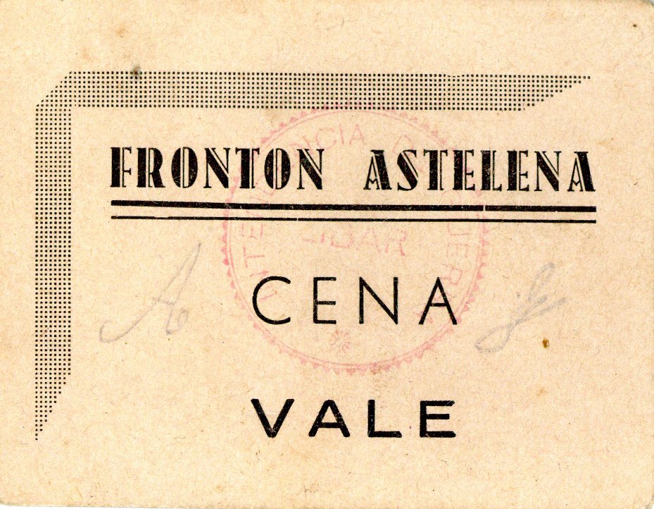 Resumen: Vale por una cena en el frontón Astelena de Eibar con sello de la Intendencia de Guerra de Eibar. 4 ejemplares. En el reverso anotaciones manuscritas a lápiz.