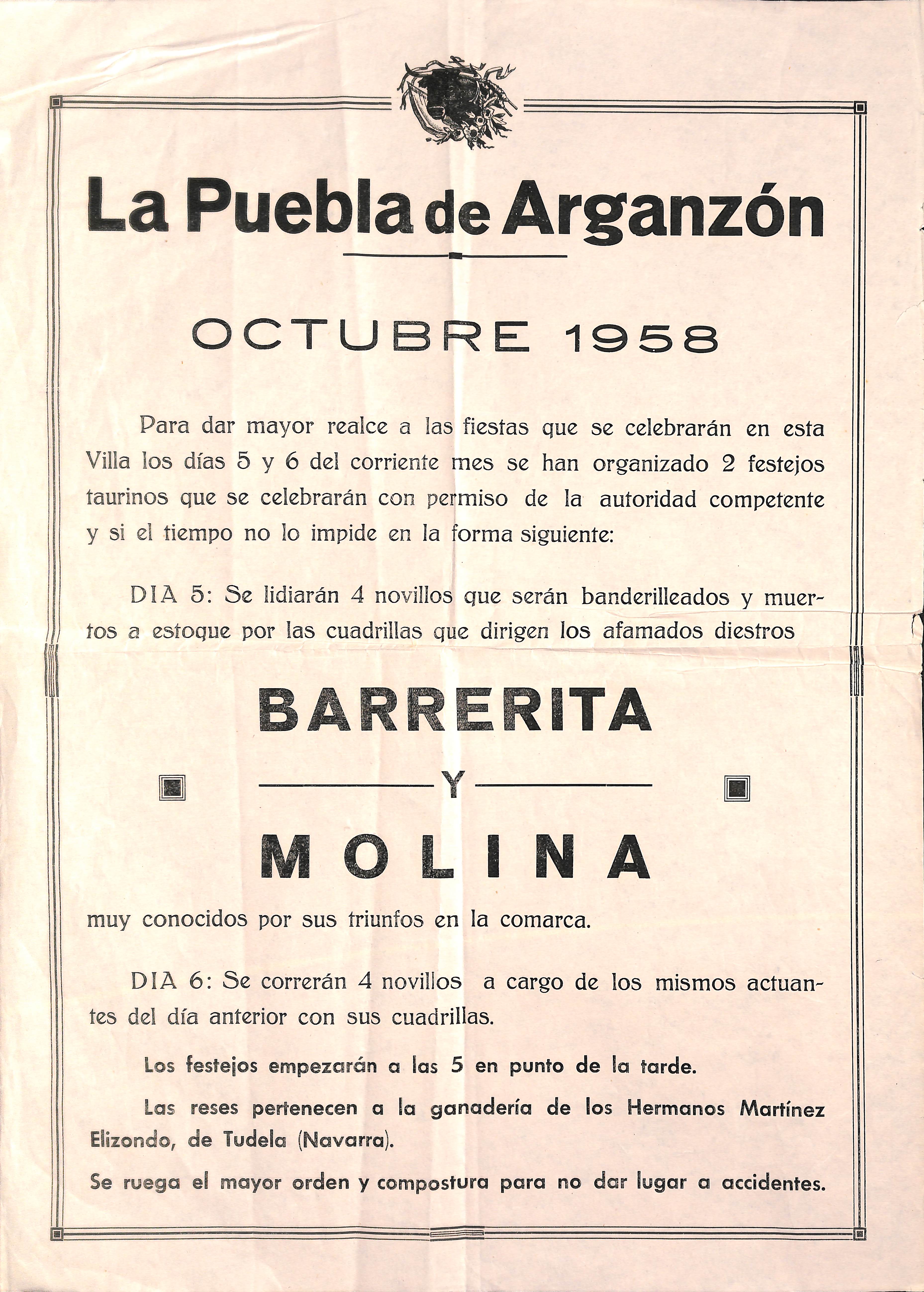 | Izenburua: | La Puebla de Arganzón [Material gráfico] : octubre 1958 : para dar mayor realce a las fiestas que se celebrarán en esta villa los días 5 y 6 del corriente mes se han organizado 2 festejos taurinos... por las cuadrillas que dirigen los afamados diestros Barrerita y Molina... |