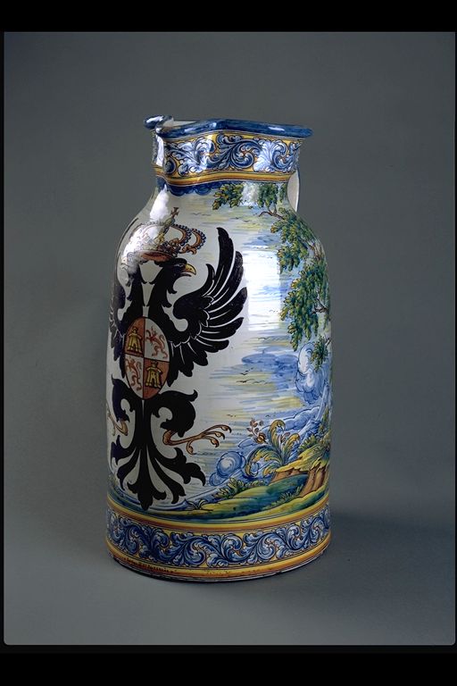 Talavera N. 74 España. Loza contemporánea (Talavera de la reina) y un escudo con una D, quizás marca del fabricante.