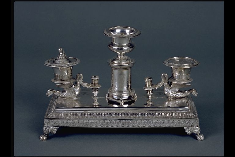 Tiene figuras de ocas. Le falta una tapa. Representa una plataforma con bordura de cenefas estampadas. Va sobre 4 patas. Los tinteros soportados sobre cisnes que llevan un candelerito adosado. En el centro un soporte o pilastra cilíndrica que lleva una copa que posaría una campanilla ausente.