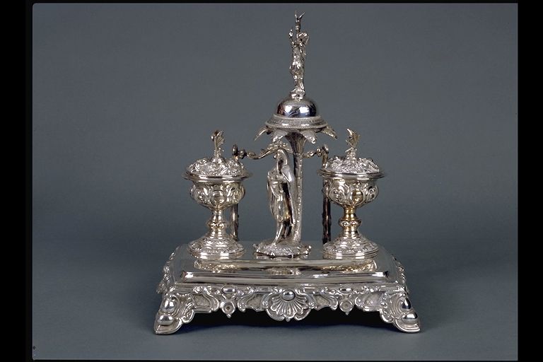 | Deskribapena: | Orfebrería Plata Mediados del siglo XIX. Campana y soporte con dos figuras. Plata repujada delicada sin contrastes. Se compone de tintero y secante. Al centro, una palmera soportando la campana y a su sombra, un morisco o bereber que fuma una gran pipa. Es una pieza que se inspira en el orientalismo y exotismo africanista, a raíz de las colonizaciones europeas en África. Estilo ecléctico y muy ligero de chapa. Aparentemente sin marcas. |
