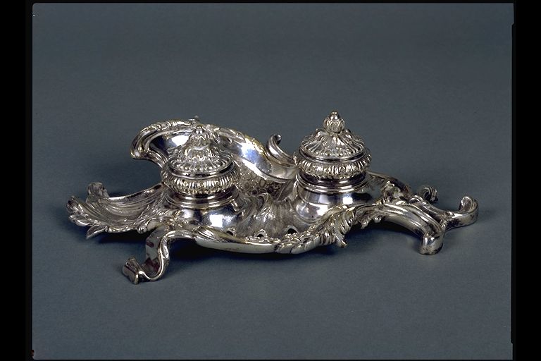 | Deskribapena: | Orfebrería Latón plateado Moderno Base en forma de hojas con dos tinteros. Estilo Luis XV, Rococó en rocalla. Es un trabajo moderno de fundición poco refinada. El material parece de latón plateado. |