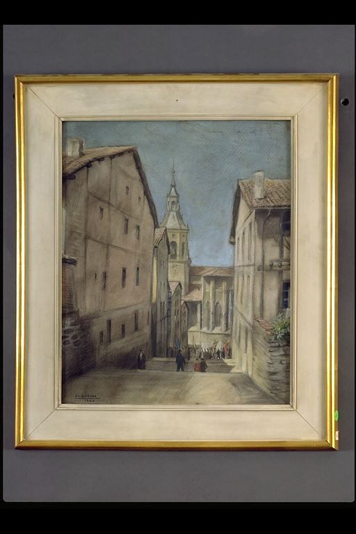 | Deskribapena: | Acuarela Cartón 1944 Vista del cantón hacia San Pedro y paso de procesión. Firmado y fechado en ángulo inferior izquierdo |