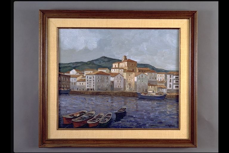 | Deskribapena: | Exposición Óleo Lienzo Vista parcial de puerto con iglesia al fondo y barcas amarradas. Firmado en ángulo inferior derecho. |