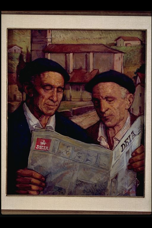 | Deskribapena: | Exposición Técnica: Óleo Materia-soporte: Lienzo Dos vascos leyendo el periódico. Al fondo la iglesia. Firmado en ángulo inferior izquierdo. |