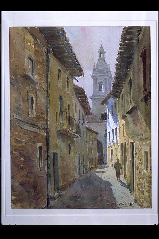 | Deskribapena: | Exposición Técnica: Acuarela Materia-soporte: Cartulina Vista de la calle mayor con torre de la iglesia al fondo. Firmado en ángulo inferior derecho. |