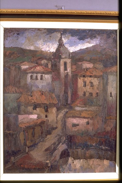 | Deskribapena: | Técnica: Óleo Materia-soporte: Lienzo Paisaje urbano de un pueblo con casas a ambos lados, al fondo montañas y cielo. Firmado en ángulo inferior izquierdo. |