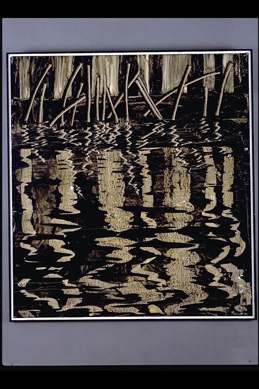 | Deskribapena: | Técnica: Barniz Materia-soporte: Tabla formica Paisaje en blanco y negro de agua y cañas de fondo. |