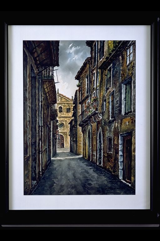 | Deskribapena: | técnica: Acuarela Materia-soporte: Papel Fecha de ejecución: 1989 Calle estrecha con noble edificio al fondo. Firmado en ángulo inferior derecho. |