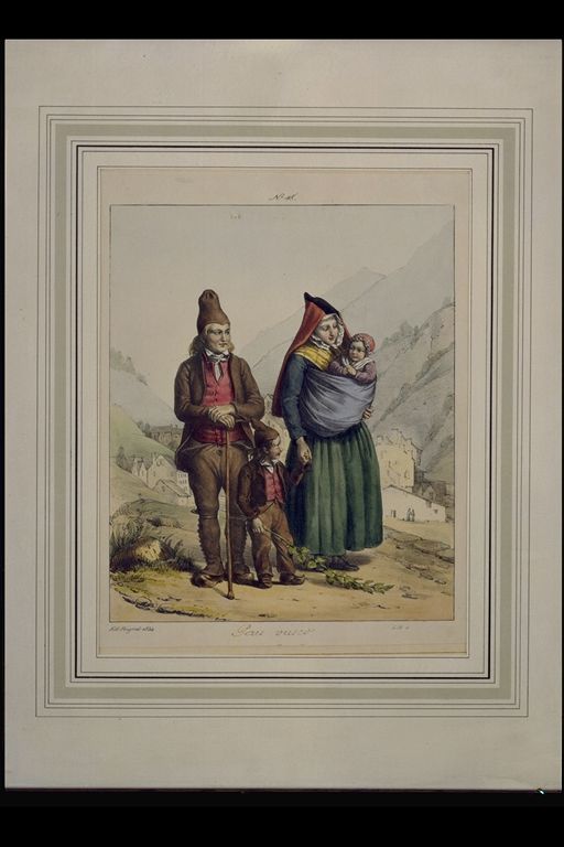 | Deskribapena: | Técnica: Litografía Materia-soporte: Papel Velin Fecha de ejecución: 1834 Familia compuesta por los padres y dos hijos vestidos con los trajes típicos de la época. Parte superior: Nº 18 . Parte inferior: Manuscrito. |