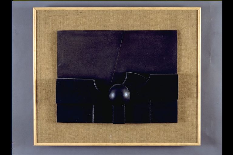 | Deskribapena: | Exposición Técnica: Cerámica Materia-soporte: Madera-Saco Escultura mural abstracta con esfera en el centro. |