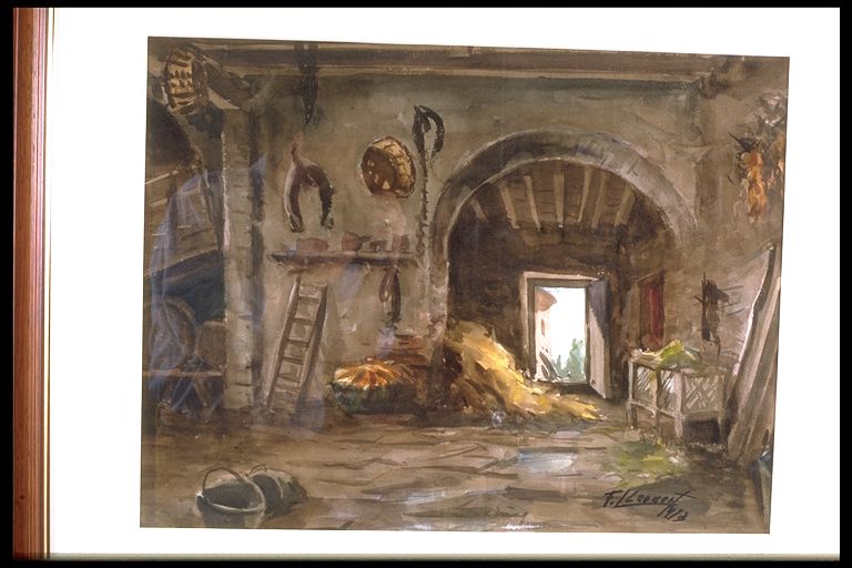 Interior con aperos campesinos, puerta abierta a la derecha.