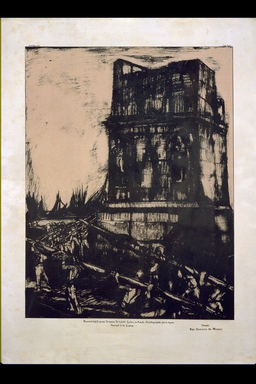 | Deskribapena: | Técnica: Litografía Materia-soporte: Calcografía Monumento y personajes tirando de una maroma. Firmado en ángulo inferior derecho. |