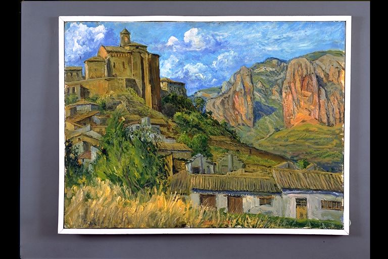 | Deskribapena: | Exposición Técnica: Óleo Materia-soporte: Lienzo Fecha de ejecución: 1985 Paisaje pueblo asentado sobre un montículo y masa montañosa en el lado derecho. Firmado en el centro inferior. |