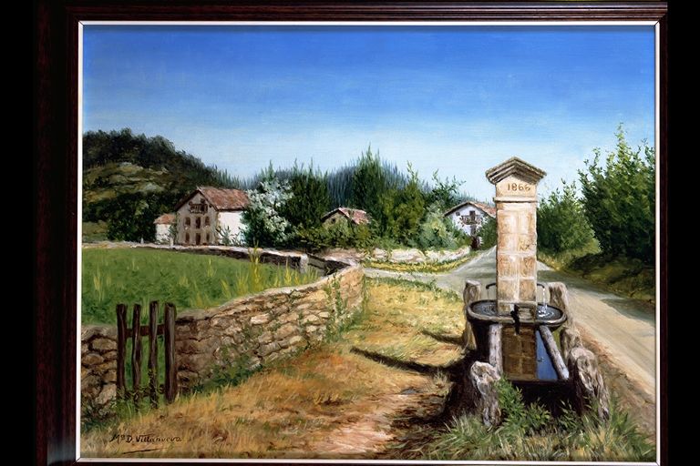| Deskribapena: | Exposición Técnica: Óleo Materia-soporte: Lienzo Vista de interior de un pueblo con la fuente. Firmado en ángulo inferior izquierdo. |