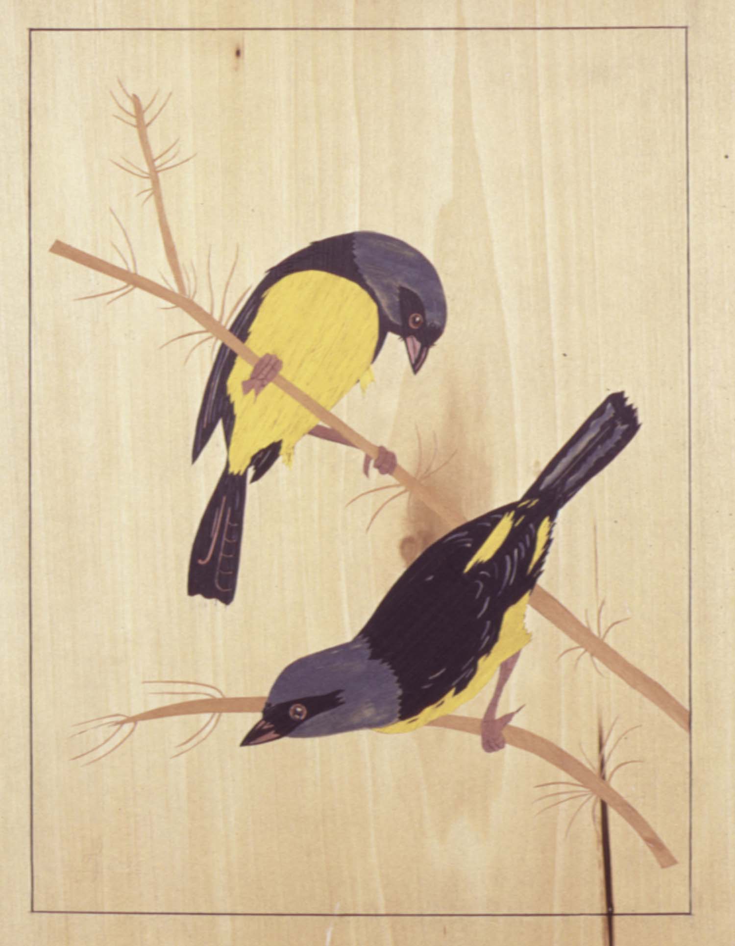 | Deskribapena: | Exposición Técnica: Taracea Materia-soporte: Madera Dos pájaros posados en ramas. |