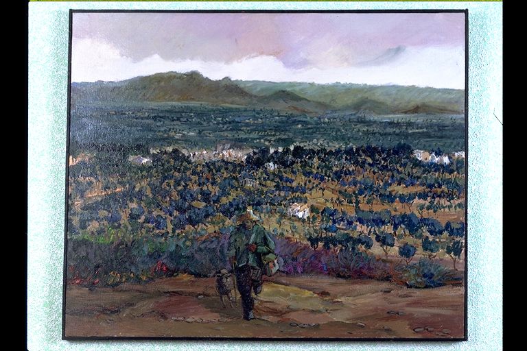Paisaje con figura caminando en primer término.