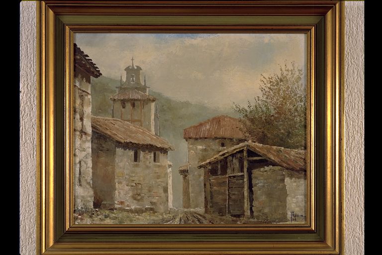 | Deskribapena: | Técnica: Óleo Materia-soporte: Lienzo Paisaje rural de la calle de un pueblo con la torre al fondo. Firmado en ángulo inferior derecho. |