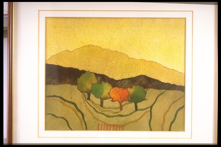 | Deskribapena: | Materia-soporte: Papel Paisaje, tierras contorneadas, cuatro árboles en el centro y empalizada en primer término. Firmado en ángulo inferior izquierdo. |