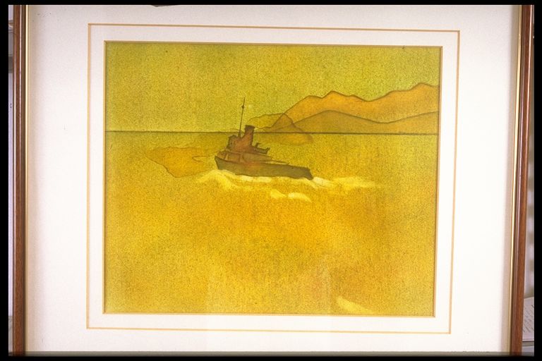 | Deskribapena: | Materia-soporte: Papel Paisaje marino con barco visto desde popa. |