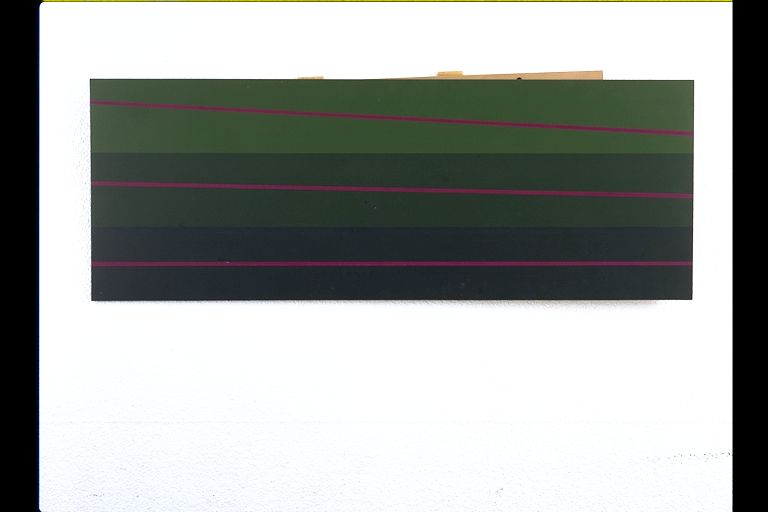 | Deskribapena: | Técnica: Acrílico Materia-soporte: Tabla Abstracción geométrica, tres franjas verticales en diferentes tonos verdes y sobre cada una de ellas una franja roja. |