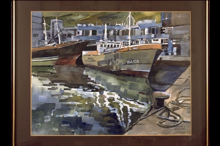 | Deskribapena: | Técnica: Acuarela Materia-soporte: Papel Puerto pesquero con barcos amarrados. Firmado en ángulo inferior derecho. |