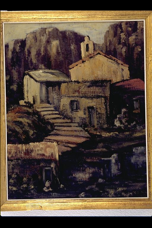 | Deskribapena: | Certamen Arte Alavés. 1965. Premio de honor. Técnica: óleo Materia-soporte: tabla El paisaje representa a una ermita rodeada de casas a la que se accede por una escalera, al fondo montañas. Pintura muy matérica de colores crudos, estilo expresionista y con detalles que sitúan al autor dentro de un expresionismo radical, apoyado en fuertes empastes, destacando el dibujo y la interpretación tonal dramática. Fecha y firma ángulo inferior derecho. |
