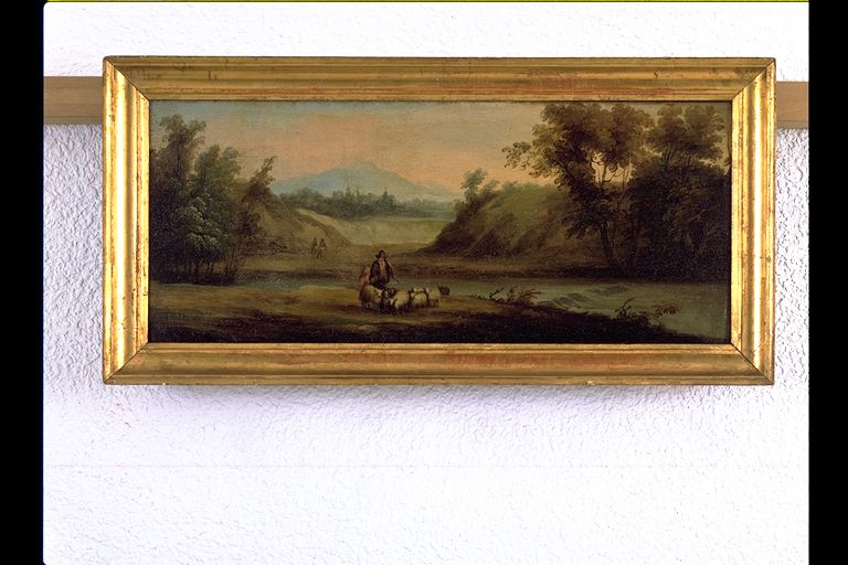 Escena pastoral de la época, aparece un pastor con su rebaño a la orilla del río. Copia española, principios del siglo XIX.