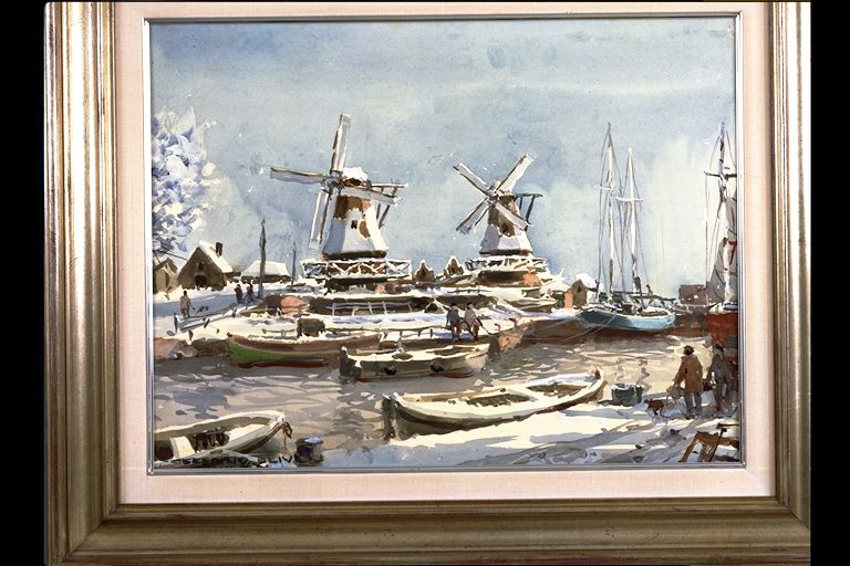 | Deskribapena: | Exposición Técnica: Acuarela Materia-soporte: Papel-Tablex Paisaje holandés con molinos nevados y barcos en el canal. Firmado en ángulo inferior izquierdo. |