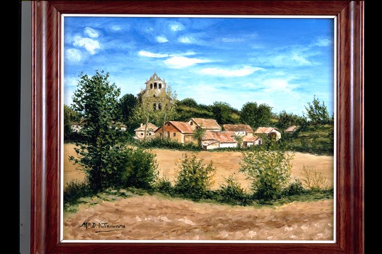 Paisaje rural con iglesia al fondo.