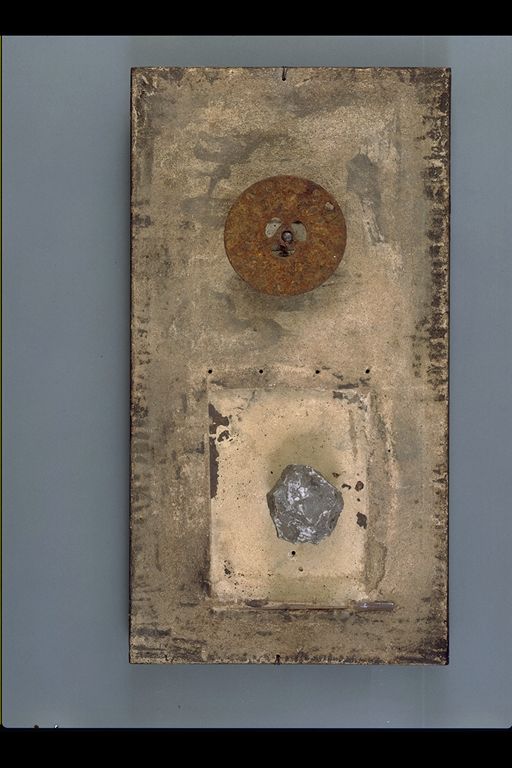 | Resumen: | Técnica: Mixta Materia-soporte: Madera Sobre marco madera, pieza circular de hierro y una piedra. |