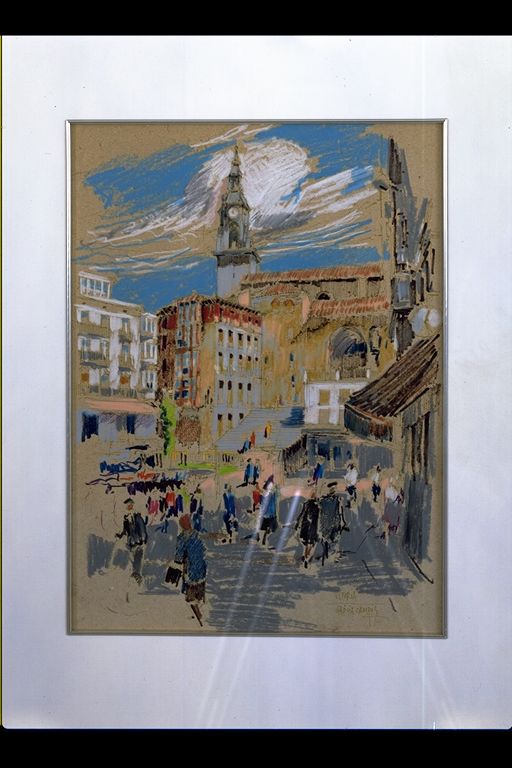 | Deskribapena: | Exposición Técnica: Ceras Materia-soporte: Papel Vista de la plaza con la subida a San Miguel. Firmado en ángulo inferior derecho. |