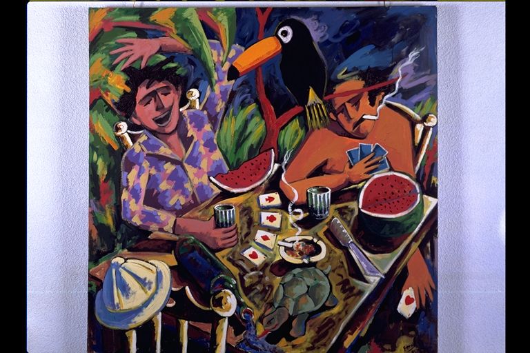 Dos hombres jugando a las cartas acompañados de un tucán y una tortuga.