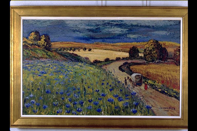 Paisaje con carreta y figuras.
