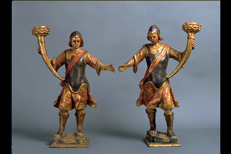 | Deskribapena: | Técnica: Talla polícroma Materia-soporte: Madera de pino Fecha de ejecución: Siglo XVIII Figura de dos jóvenes guerreros portando en sus manos un cuerno para colocar velas o cirios. Imágenes lucernarias de labor popular. |