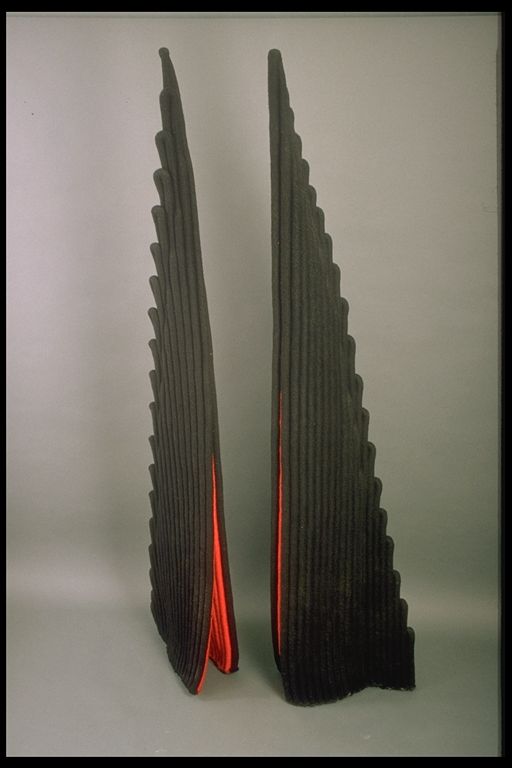 | Description: | Técnica: Textil Materia-soporte: Tapiz Escultura en tapiz de dos triángulos rectángulos negros con lado mayor escalonado, rojos por el interior. |