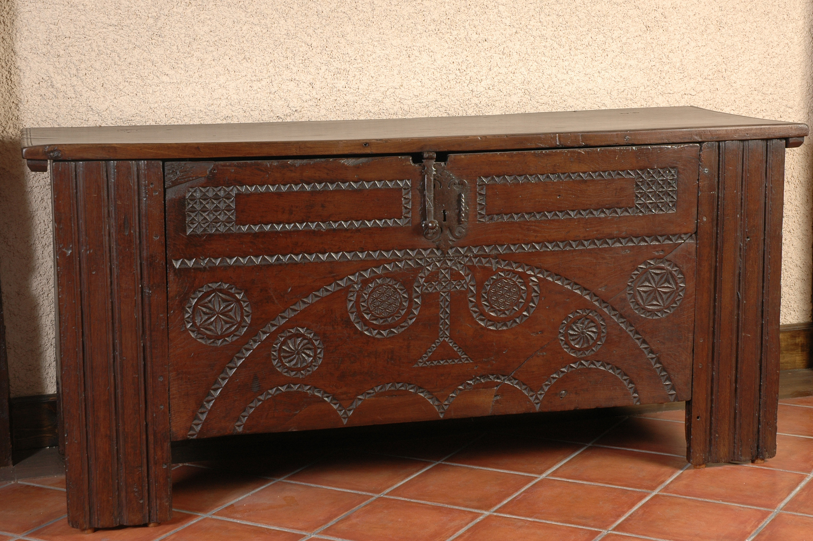 | Deskribapena: | Técnica: Ebanistería Materia-soporte: Madera de castaño Arcón vasco, siglo XVII de madera de castaño, decoración típica geométrica con cruz central estilo vasco. |