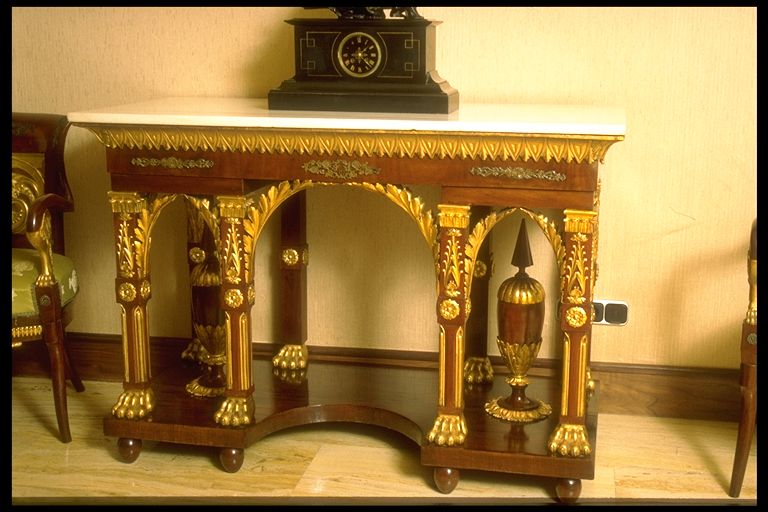 | Deskribapena: | Técnica: Ebanistería Materia-soporte: Madera caoba Fecha de ejecución: 1790 Consola de madera oscura con adornos dorados y tapa encimera de mármol blanco. Estilo imperio español. |