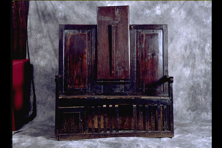 Escaño con mesa abatible y pollera en su parte inferior. Uso de cocina, trabajo popular.