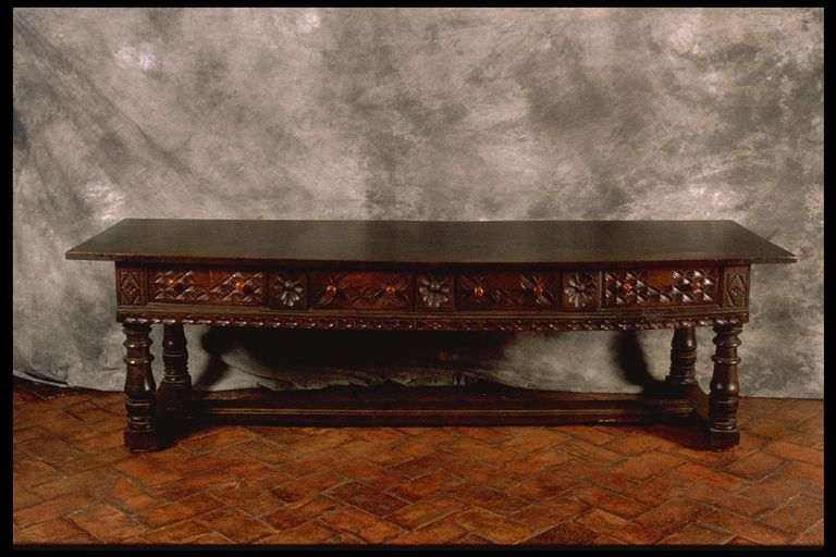 | Deskribapena: | Ebanistería Madera de roble Fecha de ejecución: Siglo XVI Mesa con patas torneadas, faldón con motivos florales y cuatro cajones. |