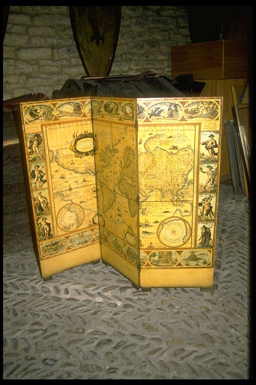 Biombo tríptico con reproducción litográfica de un mapamundi de 1493.