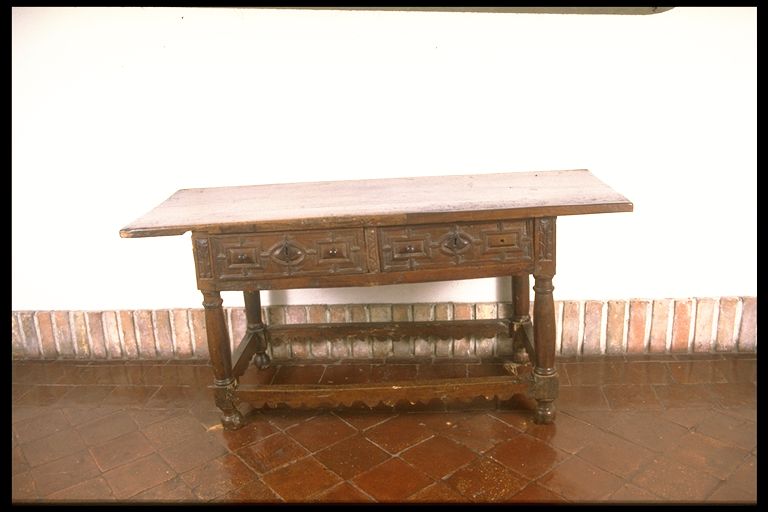 | Resumen: | Técnica: Ebanistería Materia-soporte: Madera de nogal Fecha de ejecución: Siglo XVII-XVIII Mesa estilo español con dos cajones, cuatro travesaños en la base, tapa de roble de viva pieza con bastidor de 61X120. |