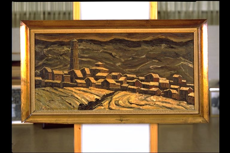| Deskribapena: | Técnica: Óleo Materia-soporte: Tabla Pueblo alargado con casas apiñadas, tejados nevados y alta torre. Firmado en ángulo inferior izquierdo. |