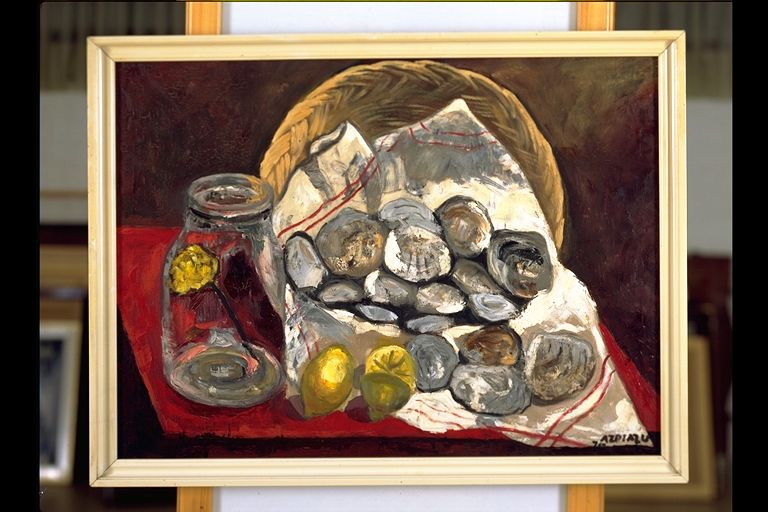 | Deskribapena: | Certamen Técnica: Óleo Materia-soporte: Lienzo Fecha de ejecución: 1975 Bodegón con ostras, cesto, servilletas, tarro y limones sobre mesa roja. Fechado y firmado en ángulo inferior derecho. |