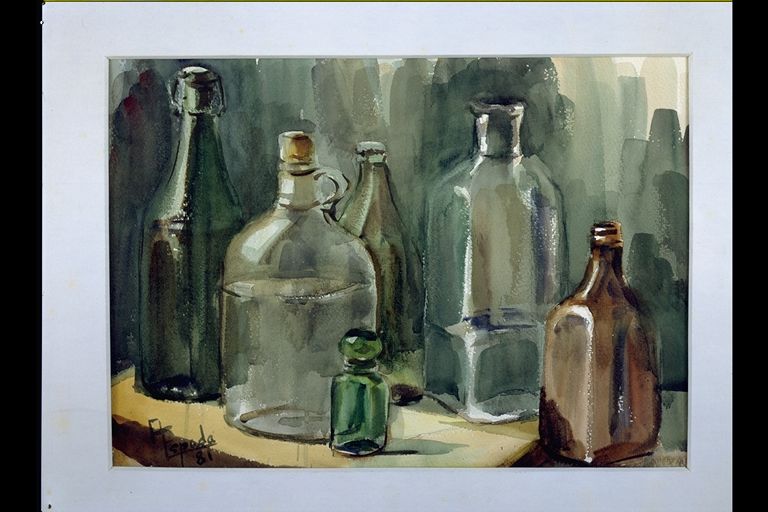 | Deskribapena: | Exposición Técnica: Acuarela Materia-soporte: Papel Fecha de ejecución: 1981 Diversas botellas en vidrio de distinto color situadas sobre una mesa. Firmado y fechado en ángulo inferior izquierdo. |