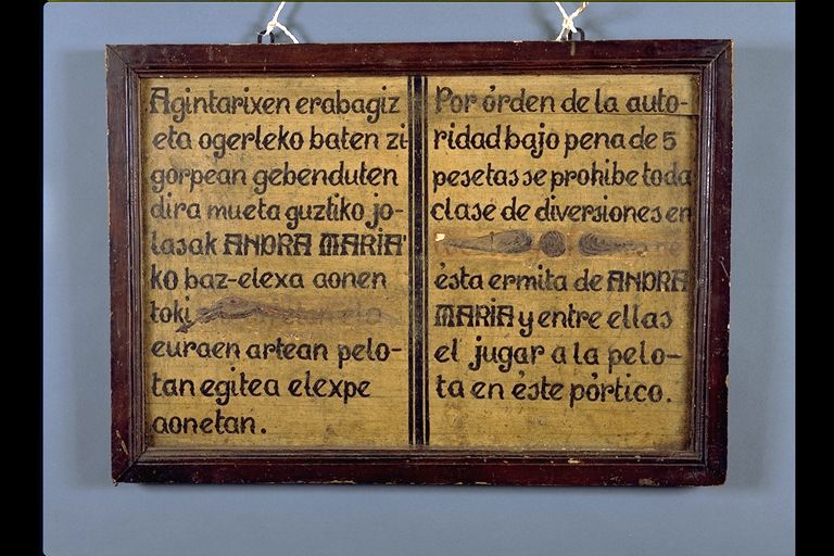 | Deskribapena: | Técnica: Pintura Materia-soporte: Madera Fecha de ejecución: Siglo XIX Cartel de pórtico de una ermita prohibiendo jugar. Está en euskera y en castellano. Labor popular. Etnográfico y lingüístico. Expurgado Nota: la pieza ya no pertenece al Patrimonio de la Fundación Vital. |