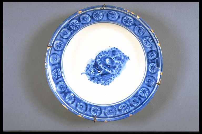 Plato decorado en esmalte azul con greca en la periferia y una flor en el centro.