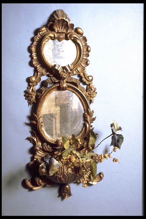 Cornucopia con dos espejos de artesanía contemporánea. Talla en madera. Trabajo moderno. Es pareja con el 2533.